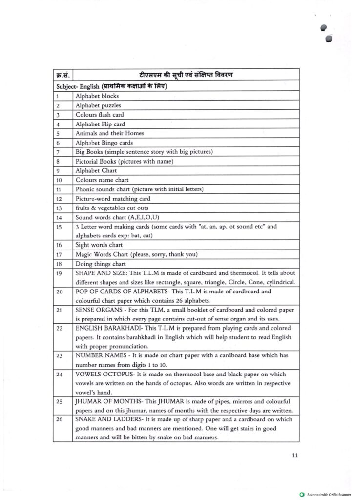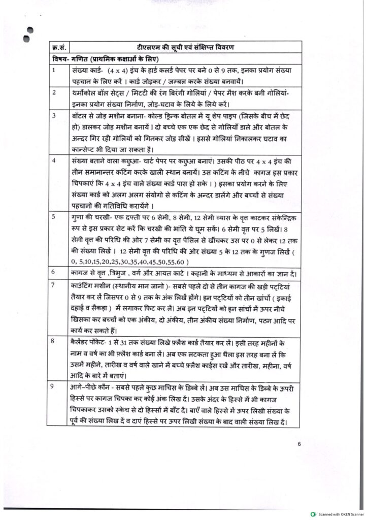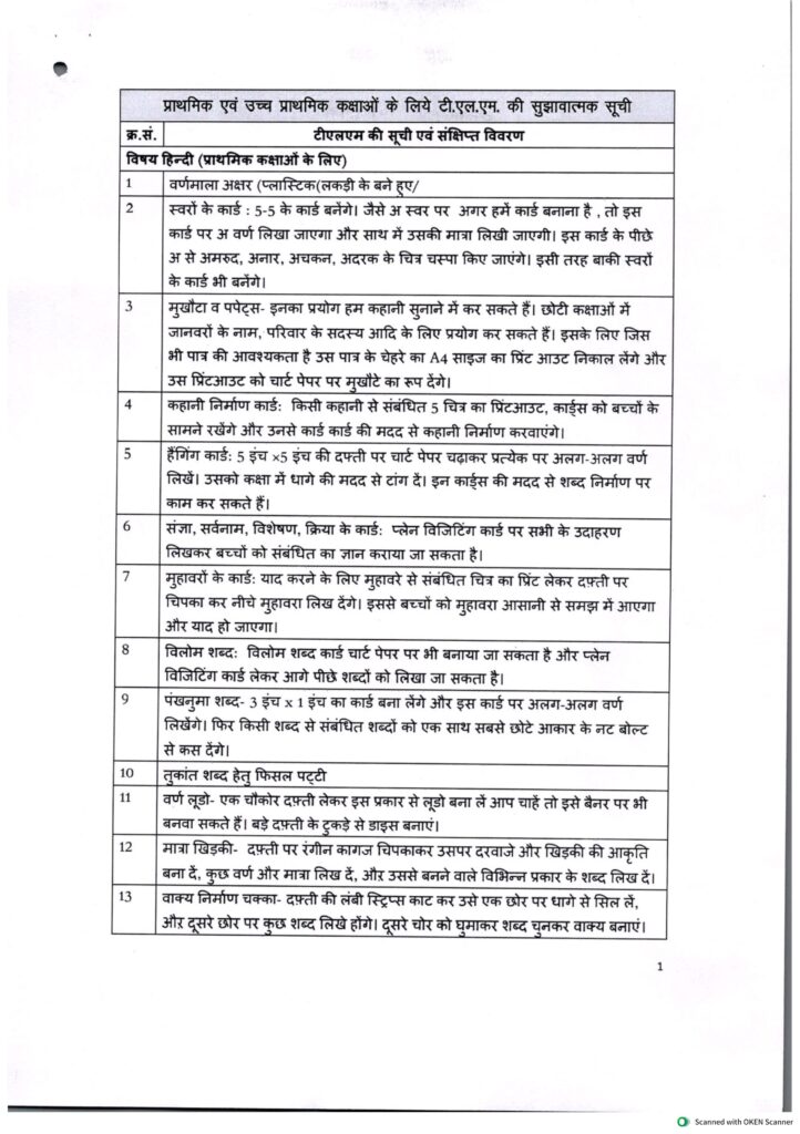 प्राथमिक कक्षाओं के लिए TLM की सुझावात्मक सूची